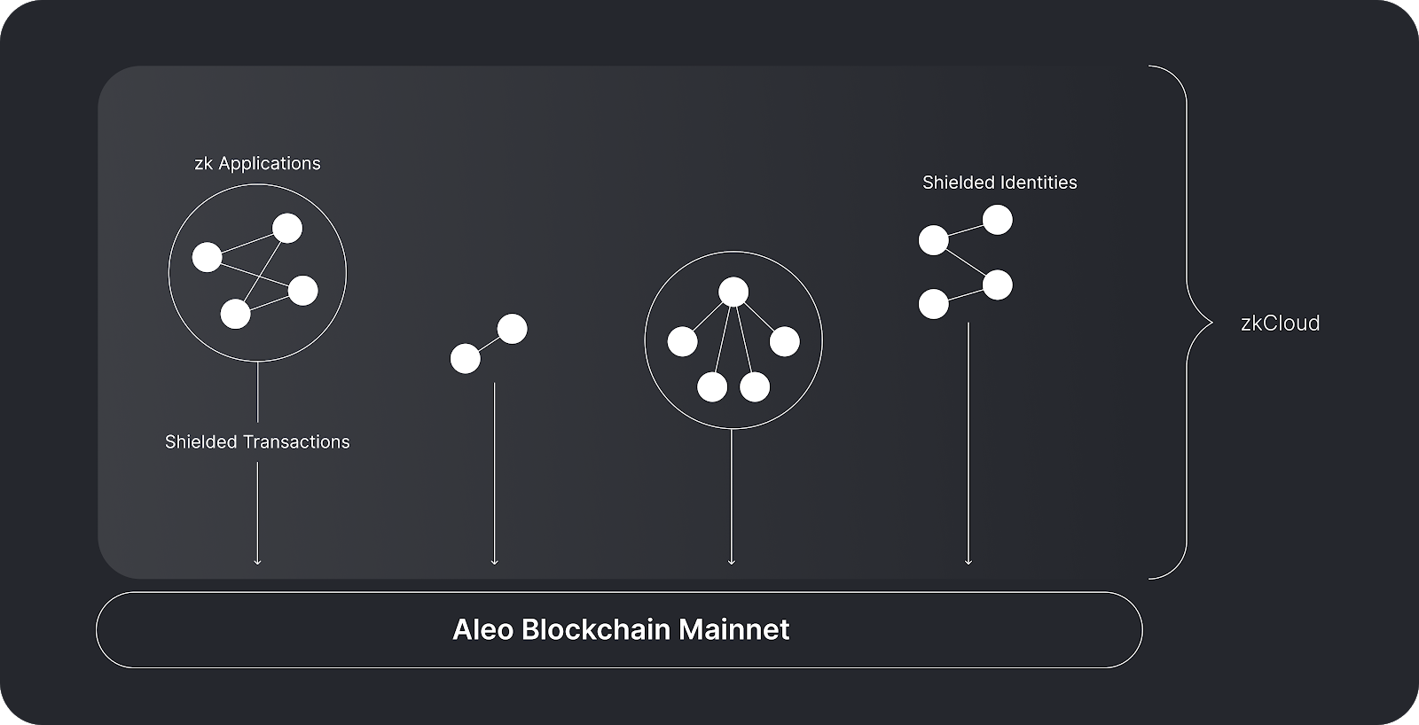 Shielded identities describe the individual(s), and shielded transactions are the means by which they interact. In Aleo, they do so off-chain in an environment we call zkCloud - a component of the Aleo stack that forms the basis for a more secure, private, and personalized paradigm for applications.